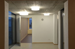 Der dreigeschossige Anbau erfolgt an der Nordfassade des Primarschulhauses. Über einen Durchbruch jeweils am Ende des Korridors werden die 3 Geschosse erschlossen. Das Aussenterrain wird teilweise abgegraben, sodass ein vom Untergeschoss zugänglicher Aussenbereich entsteht. Die Fassade sollte zeitgemäss, robust und energetisch sinnvoll sein. Diesen Anforderungen konnte mit einer Aussendämmung in Verbindung mit Klinkerriemchen entsprochen werden.